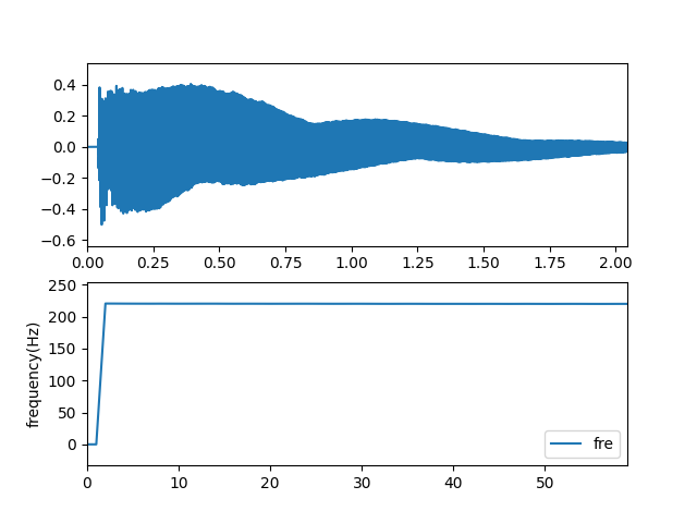 >>> import matplotlib.pyplot as plt >>> from audioflux.display import fill_wave, fill_plot >>> import numpy as np >>> audio_len = audio_arr.shape[0] >>> fig, axes = plt.subplots(nrows=2) >>> fill_wave(audio_arr, samplate=sr, axes=axes[0]) >>> >>> ax = fill_plot(np.arange(len(fre_arr)), fre_arr, label='fre', axes=axes[1]) >>> ax.set_ylabel('frequency(Hz)')
