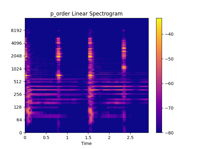 >>> import matplotlib.pyplot as plt >>> from audioflux.display import fill_spec >>> >>> fig, ax = plt.subplots() >>> img = fill_spec(origin_spec_arr, axes=ax, >>> x_coords=bft_obj.x_coords(audio_len), >>> y_coords=bft_obj.y_coords(), >>> x_axis='time', y_axis='log', >>> title='Origin Linear Spectrogram') >>> fig.colorbar(img, ax=ax) >>> >>> fig, ax = plt.subplots() >>> img = fill_spec(h_spec_arr, axes=ax, >>> x_coords=bft_obj.x_coords(audio_len), >>> y_coords=bft_obj.y_coords(), >>> x_axis='time', y_axis='log', >>> title='h_order Linear Spectrogram') >>> fig.colorbar(img, ax=ax) >>> >>> fig, ax = plt.subplots() >>> img = fill_spec(p_spec_arr, axes=ax, >>> x_coords=bft_obj.x_coords(audio_len), >>> y_coords=bft_obj.y_coords(), >>> x_axis='time', y_axis='log', >>> title='p_order Linear Spectrogram') >>> fig.colorbar(img, ax=ax)