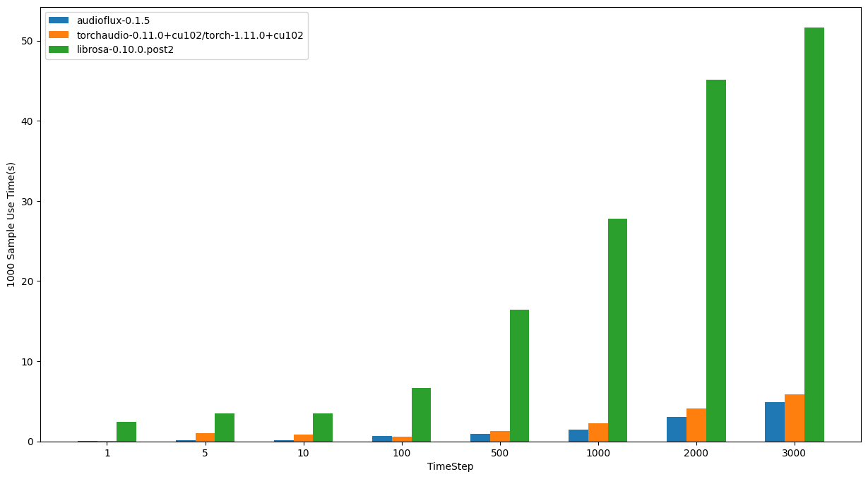 The time required to calculate the mel-spectrogram for 1000 samples according to a TimeStep of 1/5/10/100/500/1000/2000/3000. Where fft_len=2048, slide_len=512, sampling_rate=32000.